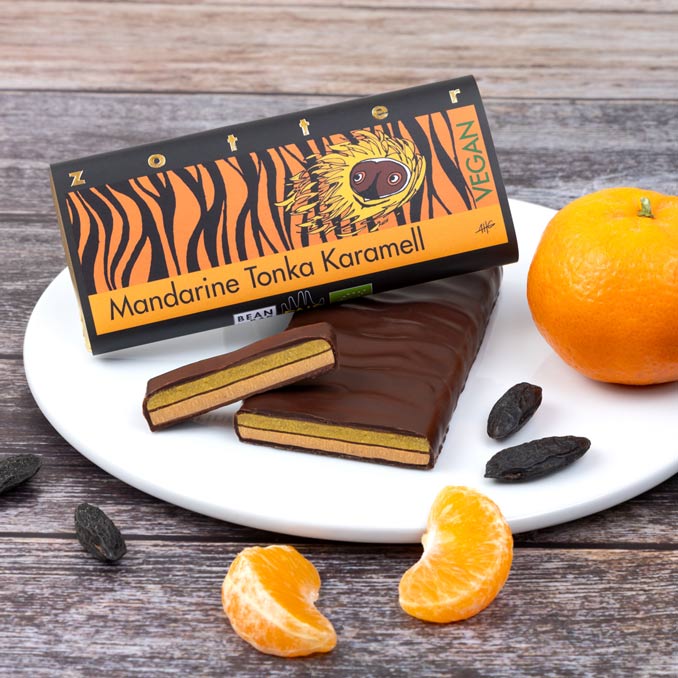 Schokolade und Karamell – das klingt bereits verführerisch. Doch wenn dann noch Mandarinen-Marzipan, duftende Tonkabohnen und ein Hauch von Timut-Pfeffer hinzukommen, wird es erst richtig aufregend! Diese handgeschöpfte, vegane Köstlichkeit ist ein wahres Fest für die Sinne.