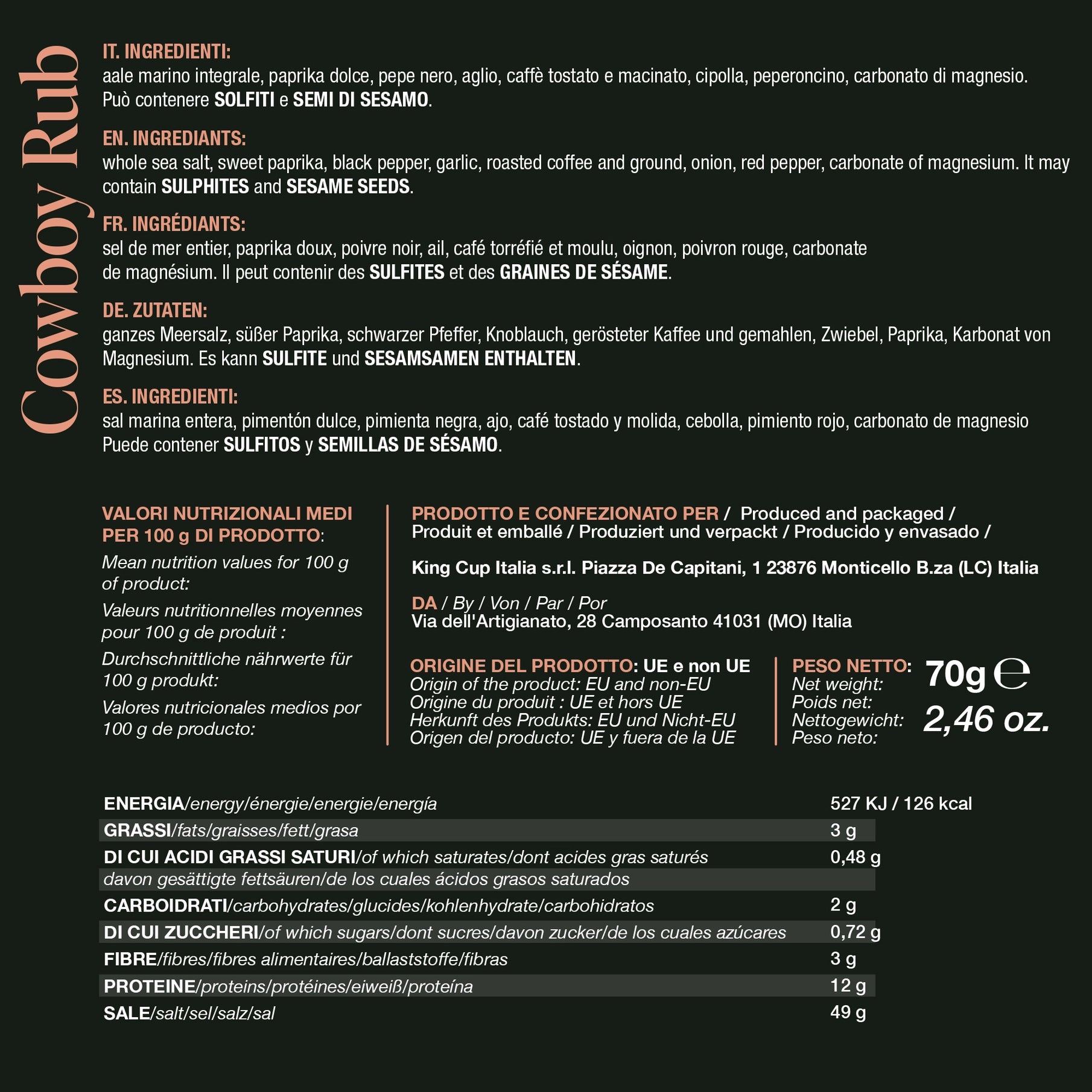 Bei Kontakt mit direkter Hitze verströmt diese Gewürzmischung einen unverwechselbaren und authentischen Duft, besonders wenn die Düfte von Kaffee, Pfeffer und Knoblauch zum Vorschein kommen. Es erweist sich als besonders geeignet für das direkte Kochen, da es zuckerfrei ist.