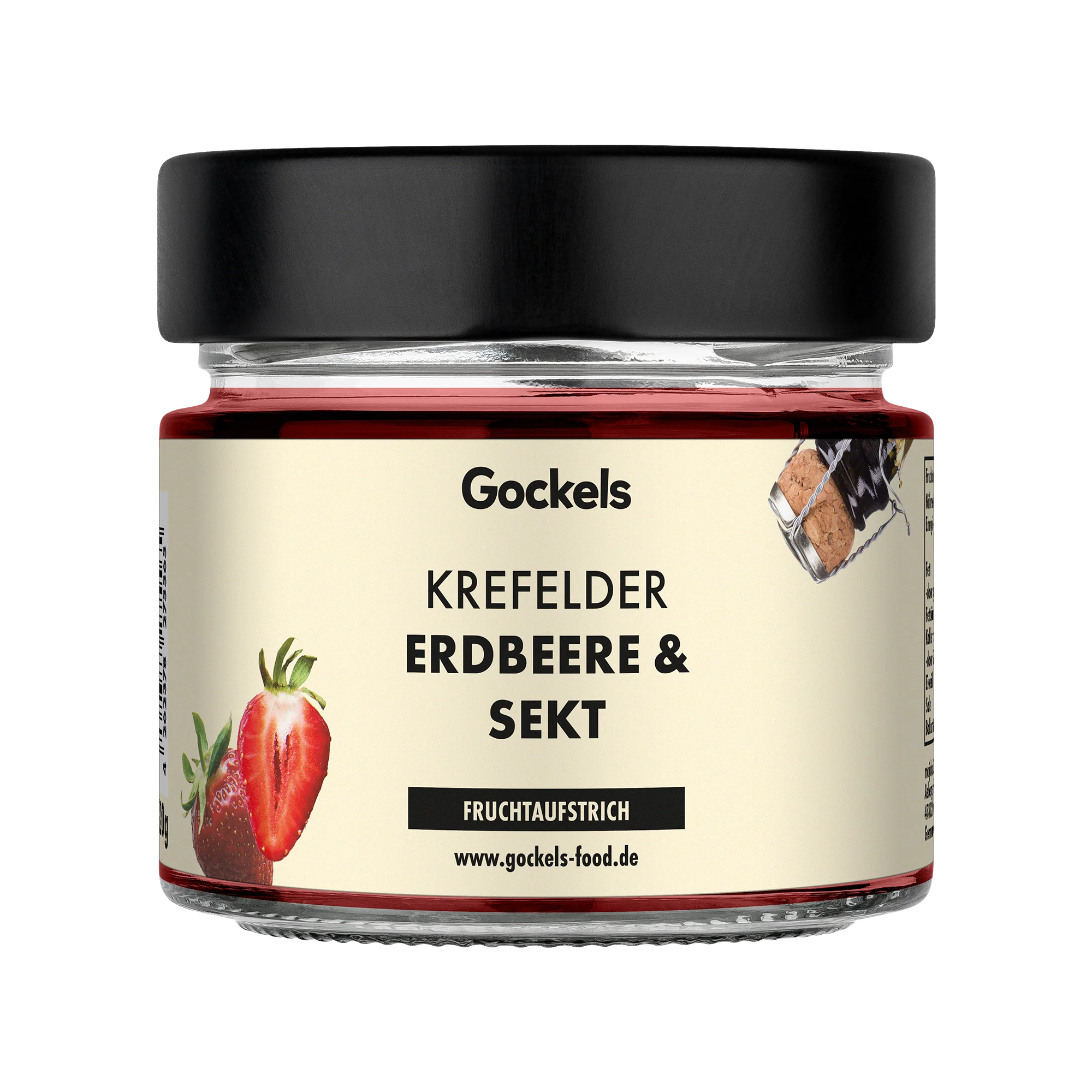 Erdbeeren, Zucker, Geliermittel Pektine, Säuerungsmittel Zitronensäure, Palmöl (aus nachhaltigem Anbau, Vegan), Kokosöl, Sekt (Sulfite, Schwefeldioxid) und Zitronensaft